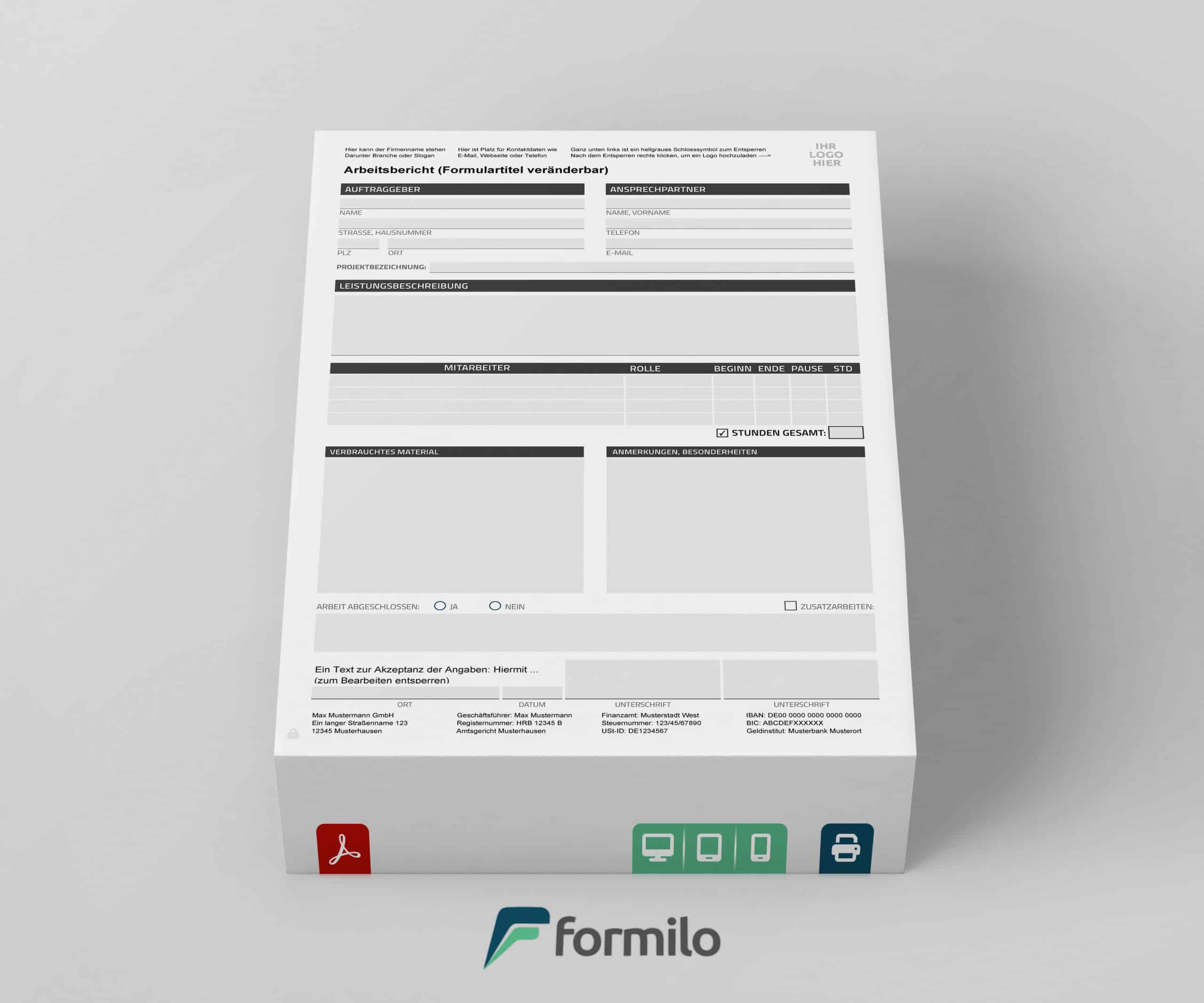 Die Arbeitsbericht Vorlage von Formilo ist eine benutzerfreundliche Lösung, um Arbeitsstunden, Materialverbrauch und den Fortschritt Ihrer Projekte schnell und effizient zu dokumentieren. Direkt nach dem Kauf können Sie die Vorlage sofort herunterladen und mit einem kostenlosen PDF Viewer wie Adobe Reader anpassen – ohne dass zusätzliche Software oder Programmierkenntnisse erforderlich sind.