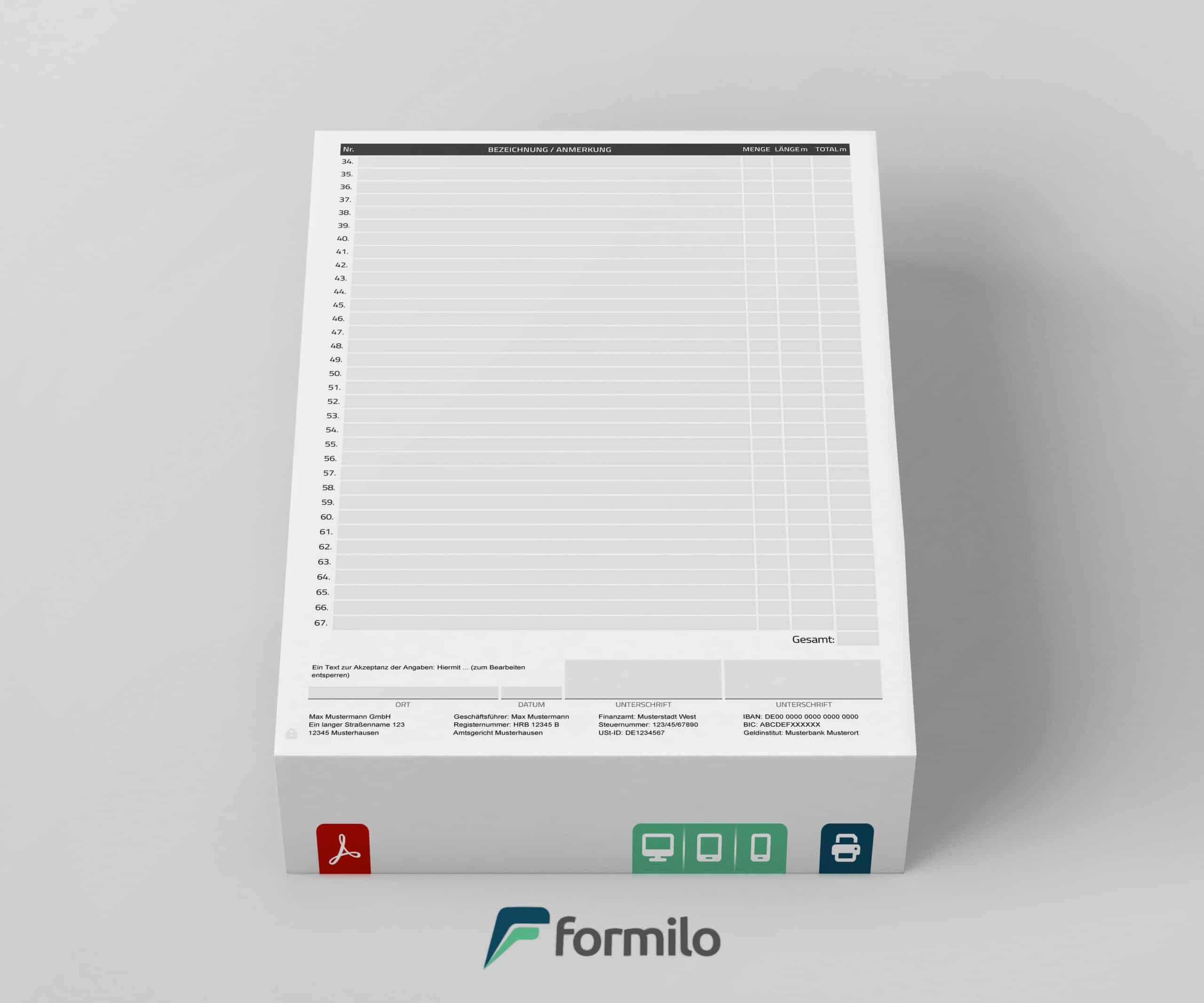 Die Vorlage lässt sich schnell und unkompliziert an die spezifischen Bedürfnisse Ihres Unternehmens anpassen. Ändern Sie Kopfdaten, Fußdaten und die Bezeichnung des Formulars, um es an Ihre Projekte und Ihr Corporate Design anzupassen. Mit der einfachen Möglichkeit, Ihr Firmenlogo in das Dokument zu integrieren, bleibt Ihre Markenidentität stets präsent. Über das eingebaute Schlosssymbol können Sie die Vorlage auf Wunsch für die tägliche Nutzung sperren, sodass nur die relevanten Felder bearbeitet werden können. Dies sorgt für eine fehlerfreie und effiziente Bearbeitung der Aufmaßdaten.