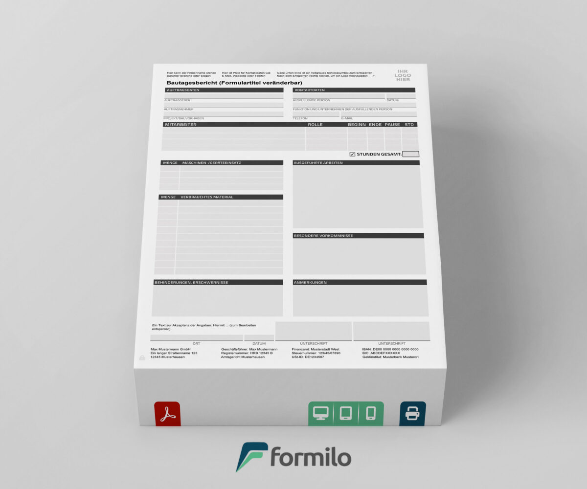 Die Bautagesbericht Vorlage von Formilo bietet eine professionelle Lösung, um Bauprojekte effizient und rechtssicher zu dokumentieren. Diese Vorlage ist für den Einsatz in verschiedenen Gewerken geeignet und ermöglicht eine einfache Anpassung der wichtigsten Informationen. Nutzer können mit einem kostenlosen PDF-Viewer, wie Adobe Reader, Kopfdaten, Fußzeilen und Bezeichnungen mühelos ändern. Zudem lässt sich das eigene Firmenlogo bequem integrieren, was den Berichten ein professionelles Erscheinungsbild verleiht.