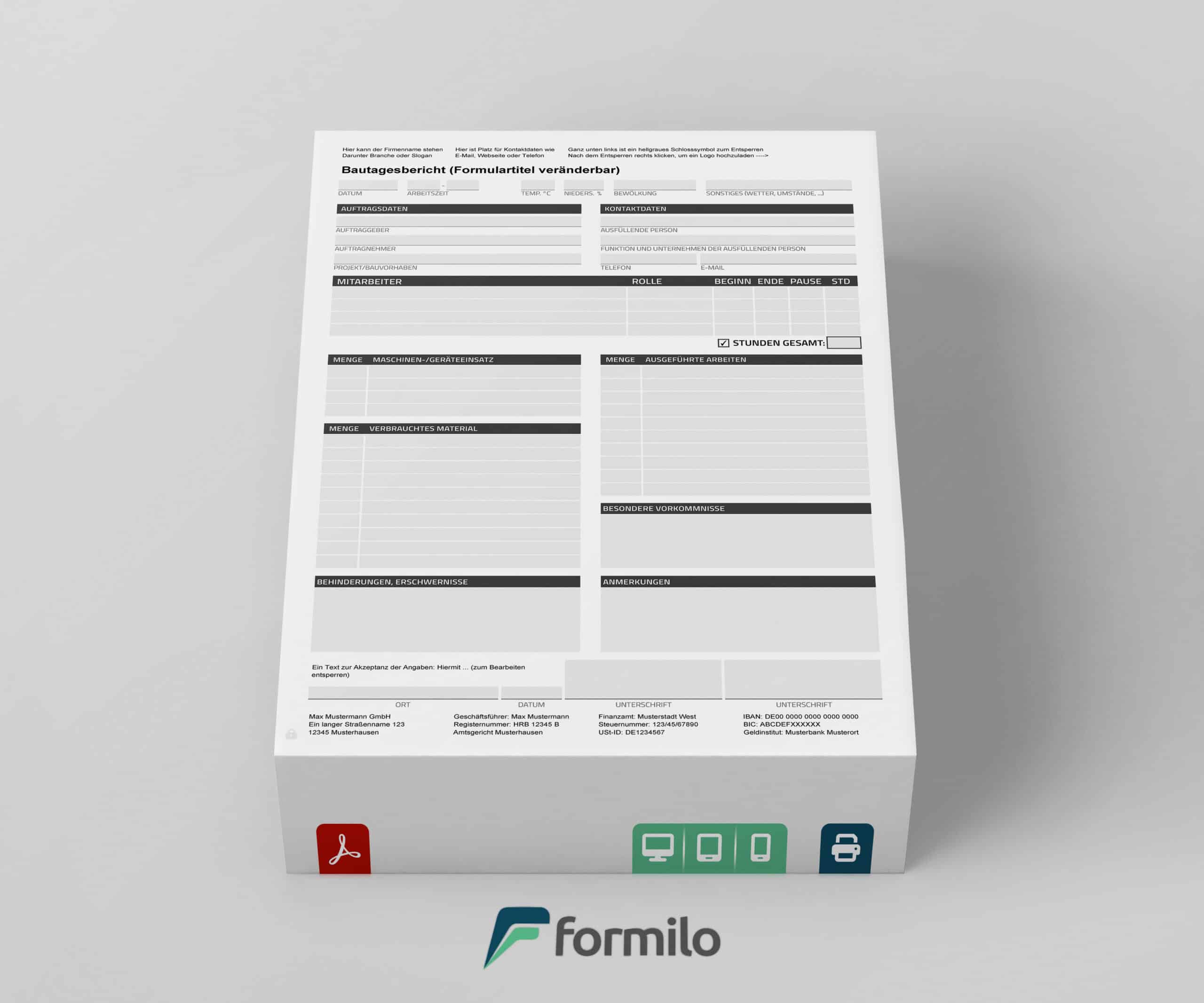 Formilo bietet insgesamt 64 unterschiedliche Varianten der Bautagesbericht-Vorlagen, die verschiedene Kombinationen von Witterungsdaten, Tätigkeitsfeldern, Zeitberechnung, Maschinenübersichten und Materialverbrauch abdecken. So finden Sie garantiert die passende Vorlage für Ihre Anforderungen.