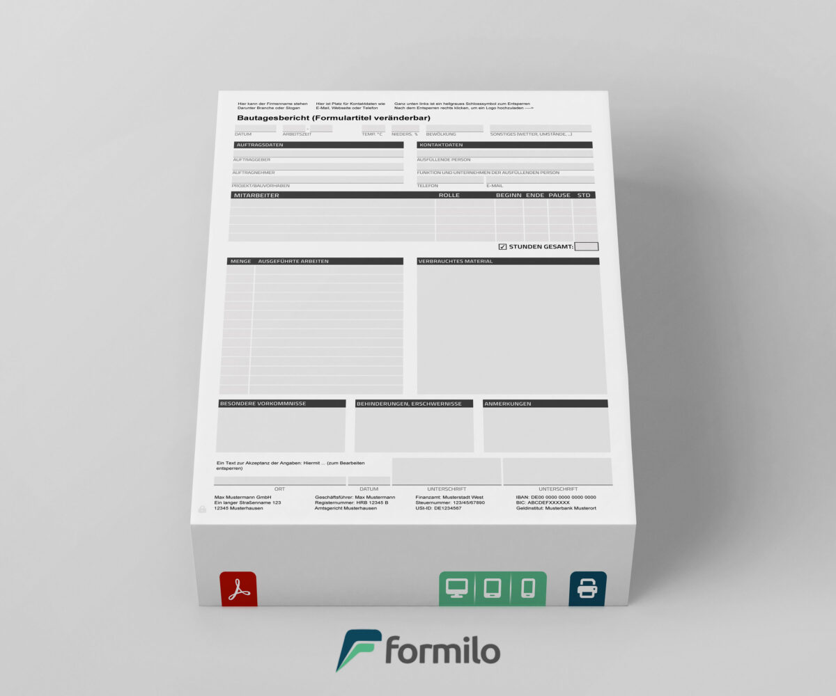 Die “Bautagesbericht Vorlage” von Formilo ist ein flexibles und leistungsstarkes Werkzeug zur strukturierten Dokumentation auf Baustellen. Diese Vorlage kann bequem heruntergeladen und direkt genutzt werden, ohne dass spezielle Software oder Programmierkenntnisse erforderlich sind. Dank der Kompatibilität mit gängigen PDF-Viewern wie Adobe Reader ist die Bearbeitung und Personalisierung mühelos möglich.