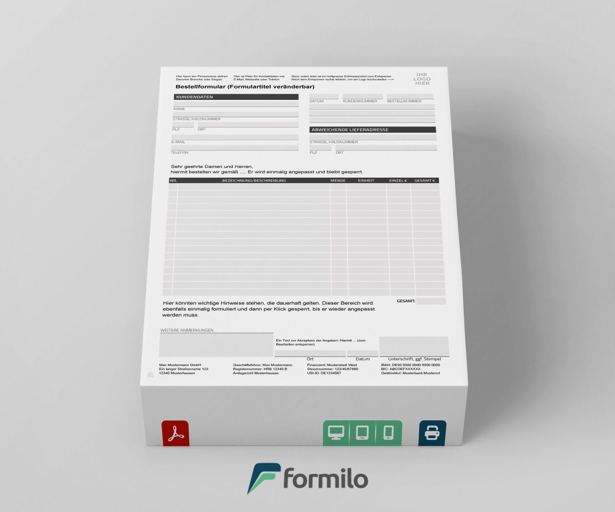 Die Vorlage kann direkt in einem PDF-Viewer wie Adobe Reader ohne zusätzliche Software bearbeitet werden. Kopfdaten, Fußzeilen und die Formularbezeichnung lassen sich anpassen. Mit wenigen Klicks kann außerdem das eigene Logo eingefügt werden. Eine integrierte Sperrfunktion schützt feste Formularbereiche vor unbeabsichtigten Änderungen.