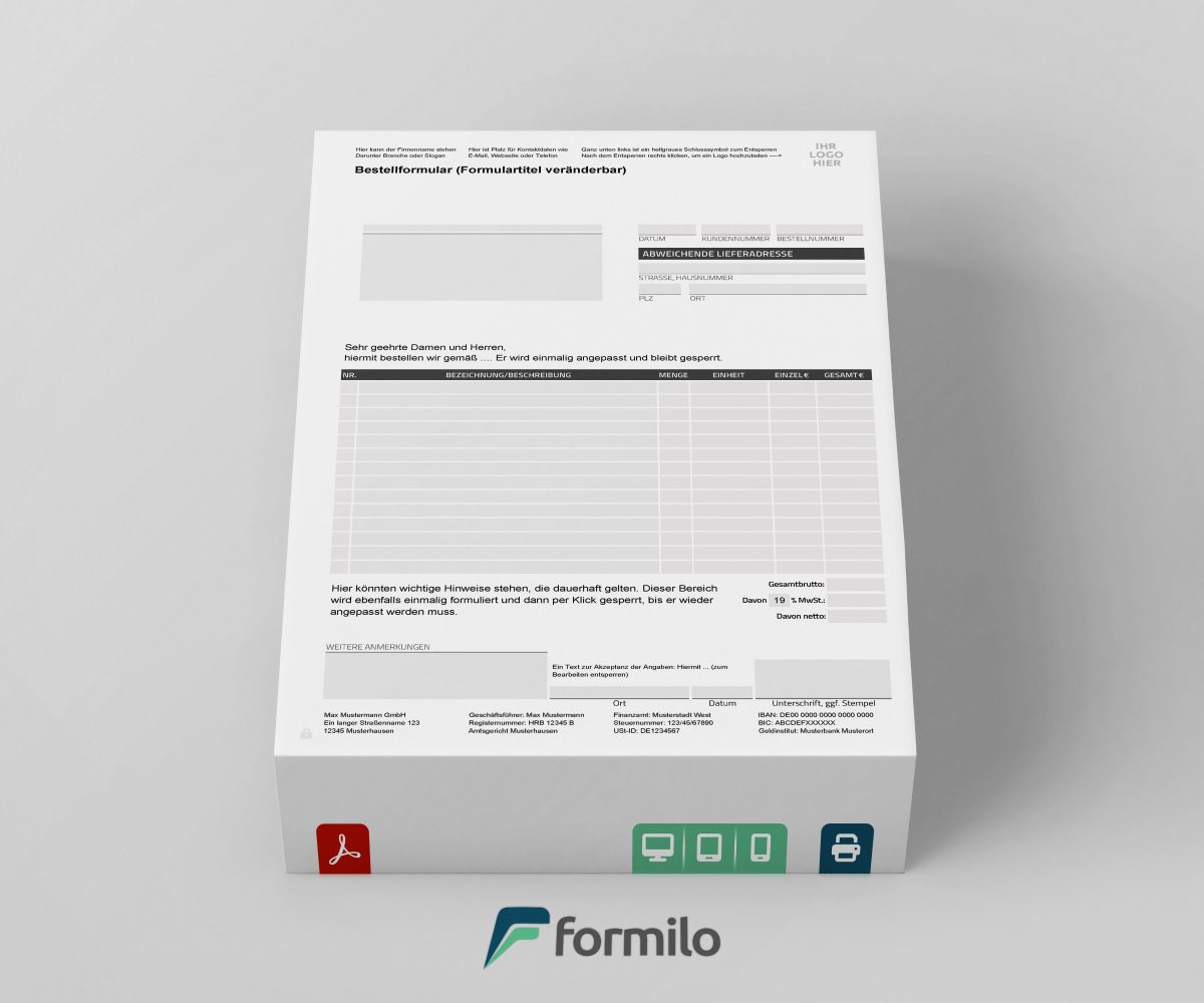 Diese Bestellformular-Vorlage ist optimal für Unternehmen, die Bestellungen effizient und strukturiert erfassen möchten. Das Format im DIN-Briefstil mit Adressfenster ermöglicht eine problemlose Nutzung für den postalischen Versand. Die automatische Berechnung der Mehrwertsteuer sorgt für eine transparente Preisgestaltung mit Brutto-Beträgen.