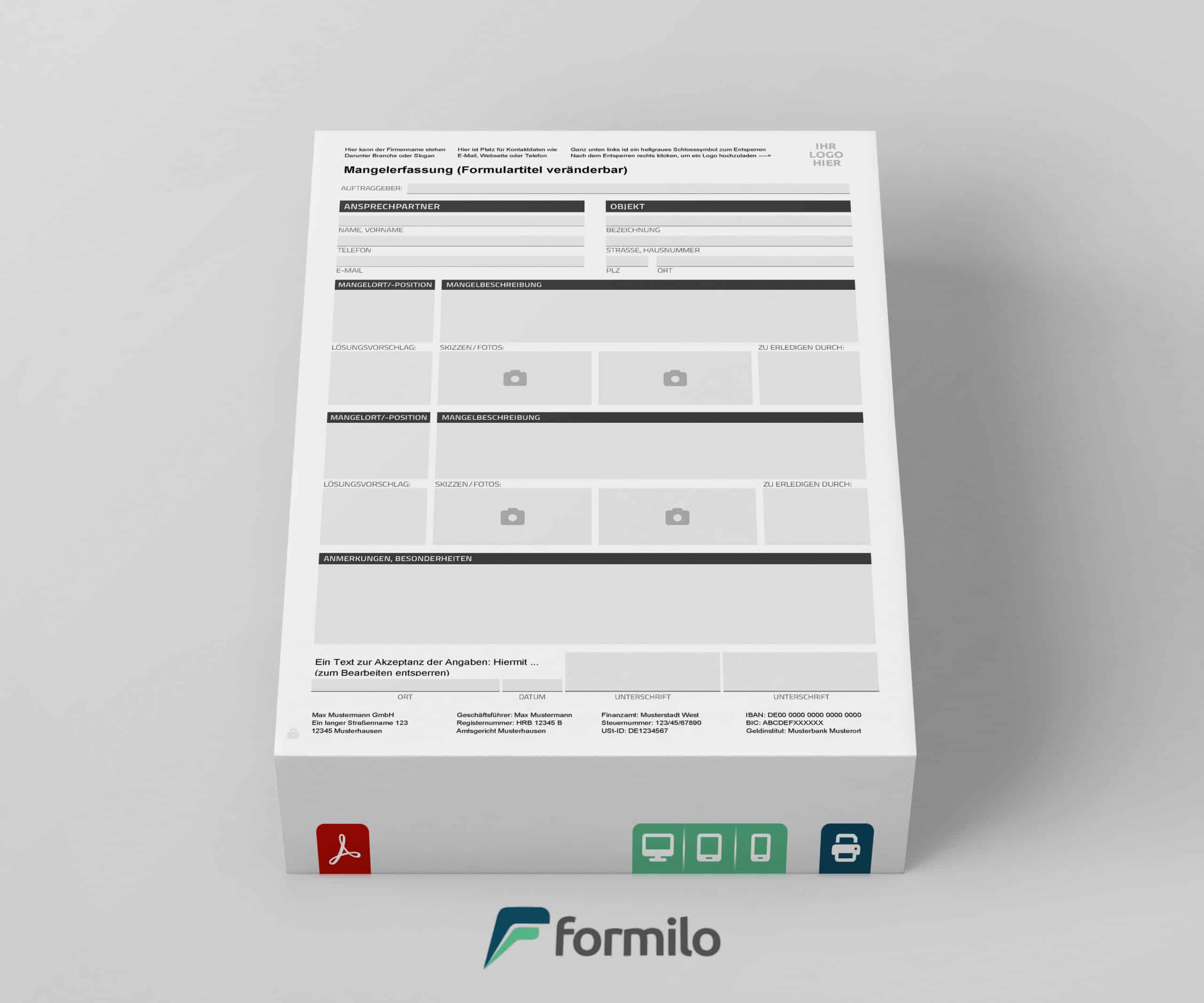 Diese kompakte Vorlage ermöglicht eine schnelle und präzise Erfassung von Mängeln. Durch die Angabe eines Ansprechpartners und die vollständige Objektadresse wird die Nachverfolgbarkeit erleichtert. Die übersichtliche Gestaltung sorgt dafür, dass alle relevanten Details schnell erfasst und weiterbearbeitet werden können.