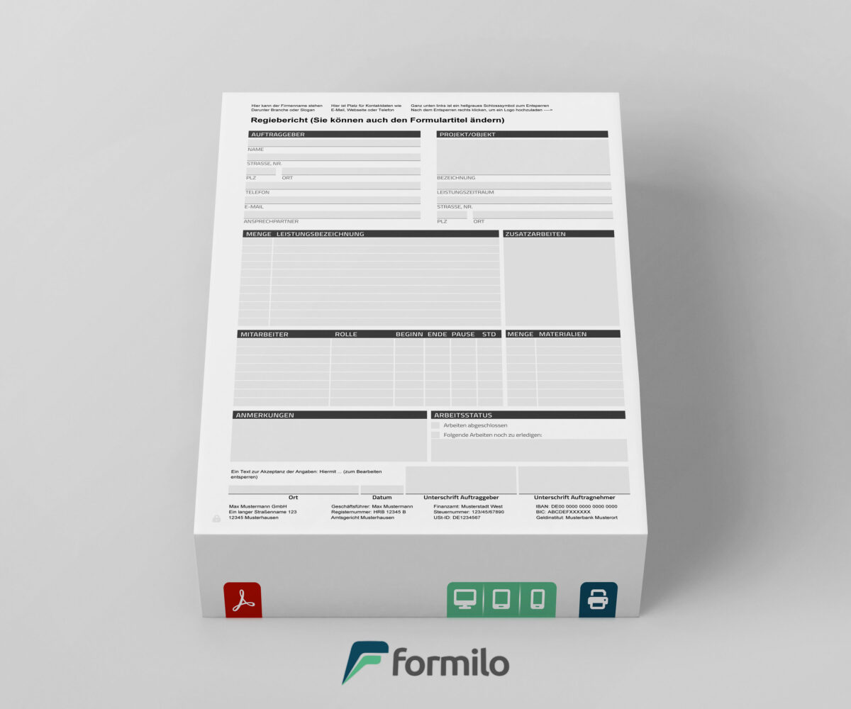 Die Regiebericht Vorlage von Formilo ist eine ideale Lösung für die strukturierte Projektdokumentation und sofort im Webshop verfügbar. Nach dem Kauf kann die Vorlage direkt heruntergeladen und ohne Programmierkenntnisse in einem kostenlosen PDF-Viewer wie Adobe Reader angepasst werden. Sie bietet flexible Optionen, um Kopfdaten, Fußdaten und die Formularbezeichnung zu ändern und das Firmenlogo hinzuzufügen, sodass die Vorlage perfekt an das Corporate Design des Unternehmens angepasst werden kann. Diese Flexibilität und Benutzerfreundlichkeit machen die Vorlage vielseitig und für zahlreiche Einsatzbereiche optimal geeignet.
