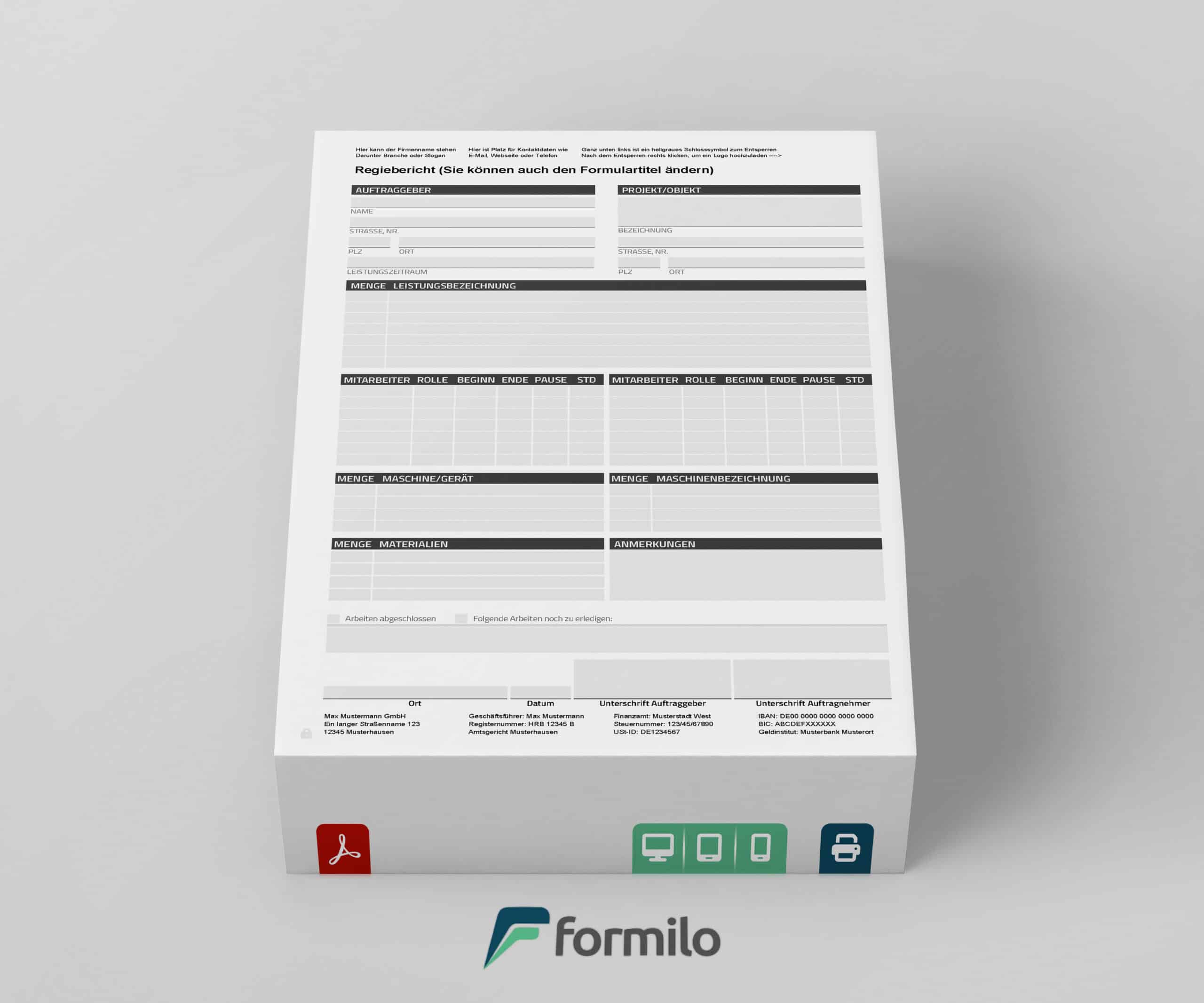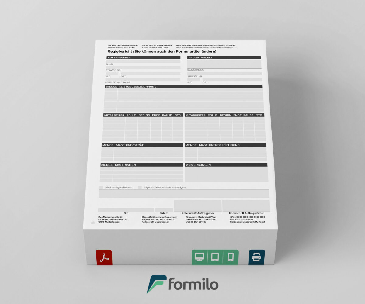Die Regiebericht Vorlage von Formilo bietet Unternehmen eine praktische und sofort einsatzbereite Lösung zur strukturierten Dokumentation ihrer Arbeitsprozesse und Projektdaten. Nach dem Kauf steht die Vorlage direkt zum Download bereit und kann mit kostenlosen PDF-Programmen wie Adobe Reader genutzt werden, ohne dass Programmierkenntnisse erforderlich sind. Der Nutzer kann die Kopfdaten, Fußzeilen und die Formularbezeichnung individuell anpassen und das Firmenlogo einfügen, sodass das Dokument dem Corporate Design des Unternehmens entspricht.