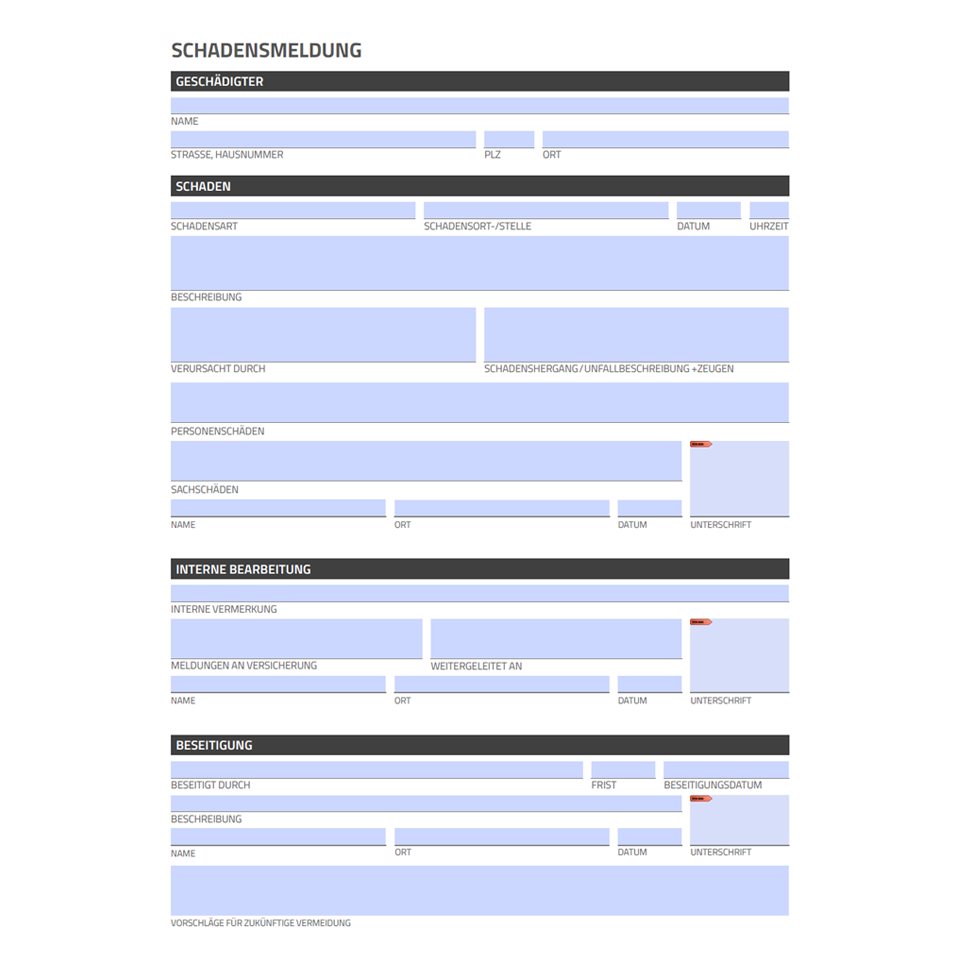 Schadensmeldung Ausführlich – Kostenlose interaktive PDF Vorlage