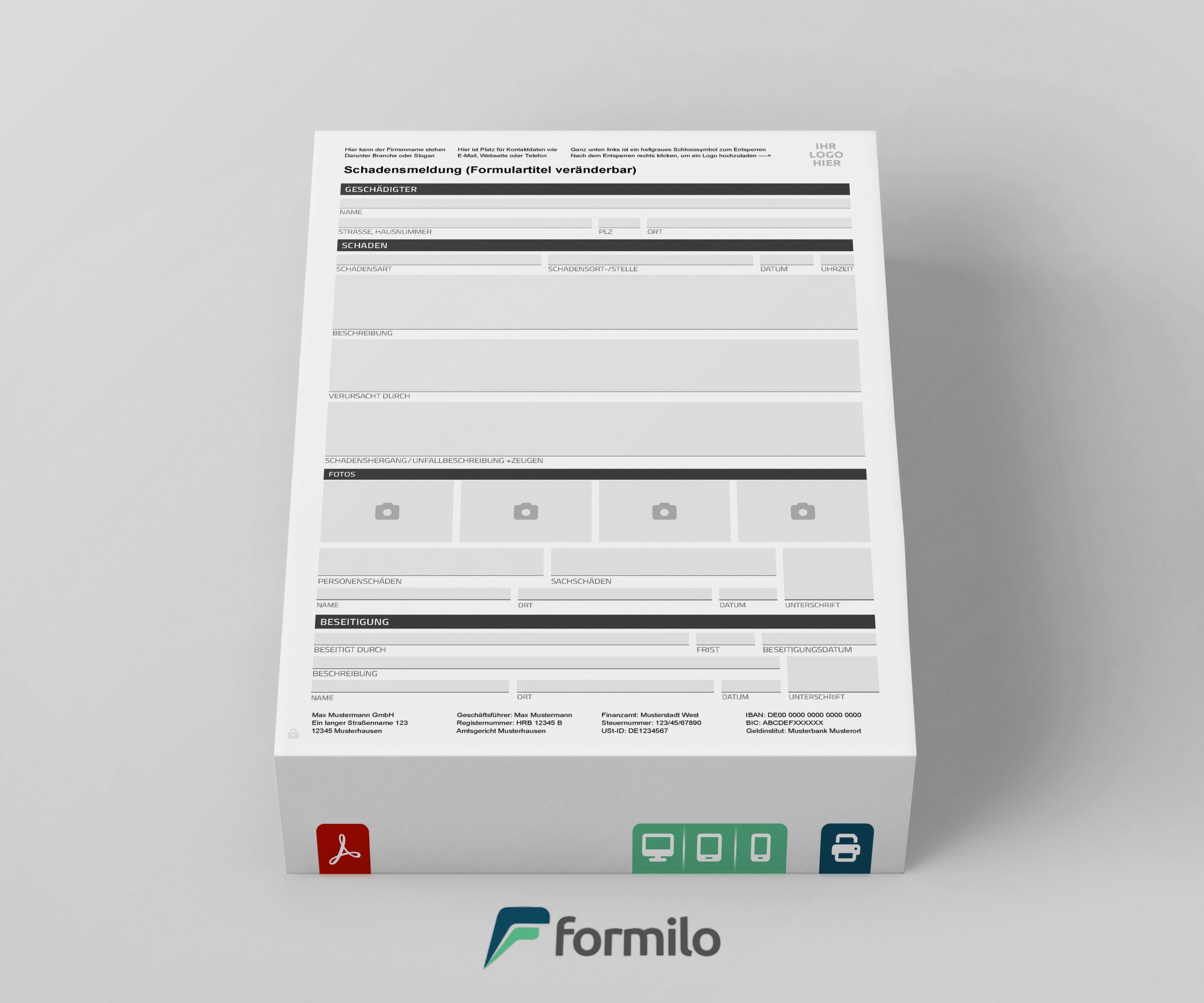 Die Schadensmeldung Vorlage von Formilo ist eine sofort einsatzbereite und flexibel anpassbare PDF-Vorlage für Unternehmen. Sie ermöglicht eine strukturierte und rechtssichere Dokumentation von Schadensfällen. Die Vorlage kann mit einem kostenlosen PDF-Viewer wie Adobe Reader ausgefüllt und individuell angepasst werden – ohne Programmierkenntnisse.