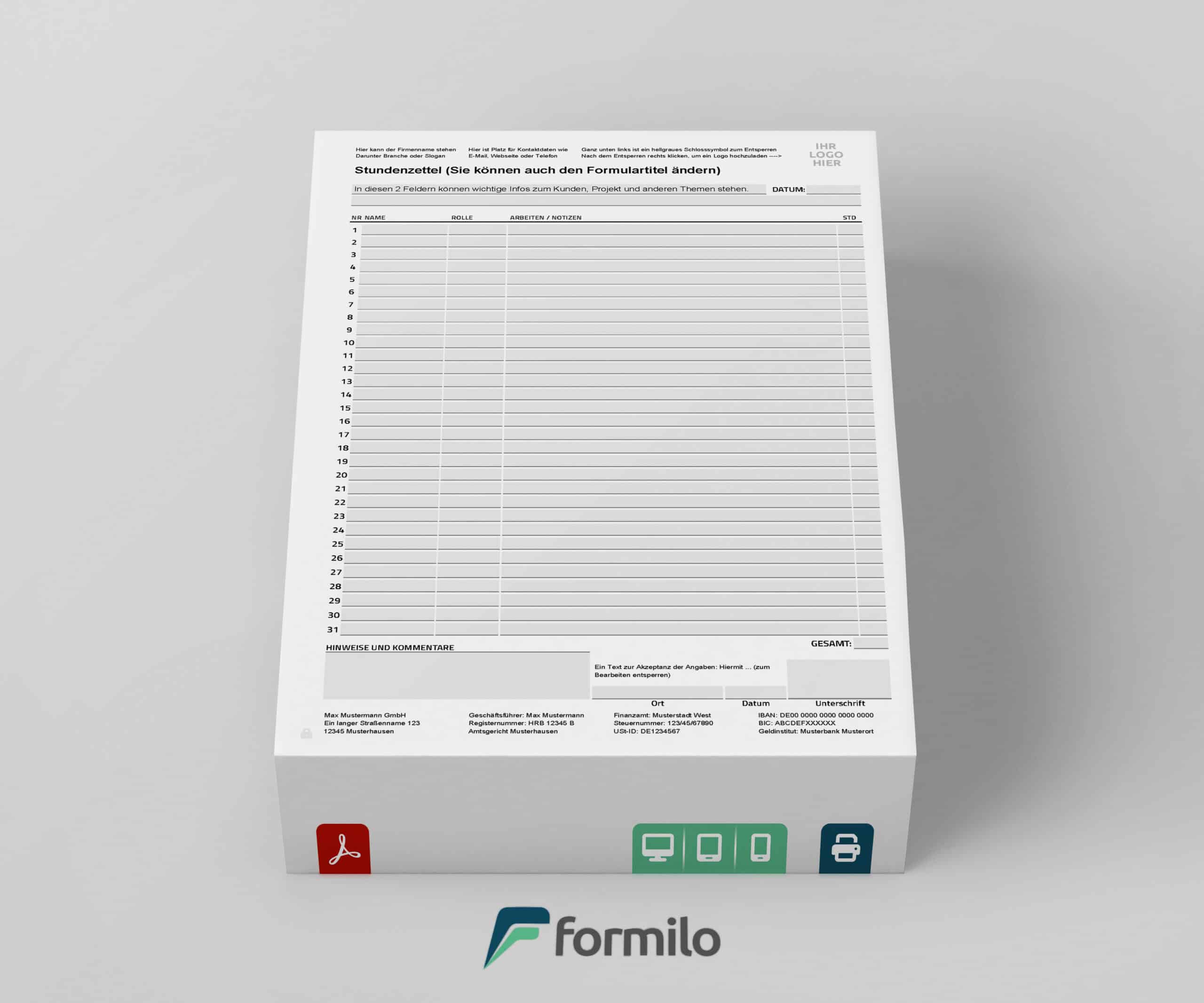 Die digitale Stundenzettel-Vorlage von Formilo revolutioniert die Arbeitszeiterfassung in Unternehmen. Verfügbar zum sofortigen Download, ermöglicht sie eine schnelle und effiziente Personalisierung direkt über einen kostenlosen PDF Viewer wie Adobe Reader. Diese Vorlage vereinfacht das tägliche Management von Arbeitszeiten durch ihre benutzerfreundliche Schnittstelle und flexible Anpassungsoptionen.