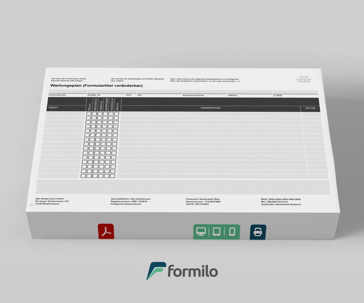 Diese Wartungsplan Vorlage ist optimal für Unternehmen, die mehrere Anlagen oder Objekte regelmäßig warten und dokumentieren müssen. Der strukturierte Aufbau kombiniert periodische Wartungsintervalle, ein flexibles Kommentarfeld sowie eine ausführliche Kopfdatenzeile mit Anschrift, Ansprechpartner und Kontaktdaten. Das Formular im PDF-Format lässt sich sofort nach dem Kauf herunterladen und ohne Zusatzsoftware direkt mit einem PDF Viewer wie Adobe Reader anpassen und ausfüllen.