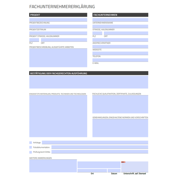 Fachunternehmererklärung Vorlage – Mehrere Projektadressen – Produkte, Technologien – Qualifikationen, Zertifikate – Projektbeteiligte – Risiken, Einschränkungen, Garantie